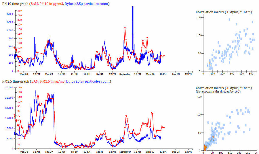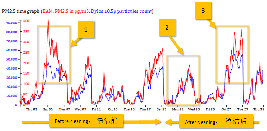 It is now 10 days since the cleaning has been done, and the situation has definitely improved for the correlation between BAM and Dylos. From the graph below, which shows the measurements before and after the cleaning, the zone indicated with number (2) shows a very good similarity (correlation) between BAM and Dylos. But, under condition of heavy pollution, there are still consistent signs of leveling (deviation in measurement), as highlighted with zone number (1) and (3). The deviation seems however less worse after the cleaning (zone (3)) than before (zone (1)). We are contacting the Dylos company, to consult them on this leveling phenomenon, and will update this post later.