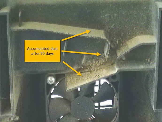 So, no surprise, after opening the Dylos monitor, we confirmed that the internal air channels are definitely saturated, by an accumulation of dust during the last 50 days: