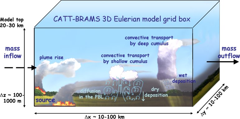 The CPTEC team has done an excellent work at providing a simple and detailed explanation on the underlying concepts used by their forecast model, called BRAMS (for Brazilian developments on the Regional Atmospheric Modelling System). The picture below (from the CPTEC) is giving an insight on the workflow for their model (source -> transport -> deposition).