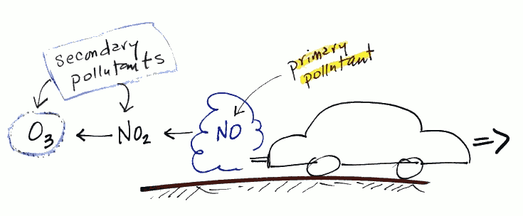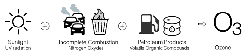 Unlike particulate matter (PM2.5), the ground-level Ozone is not emitted directly. It is instead produced through a series of chemical reactions that occur in presence of nitrogen oxides, volatile organic compounds, sunlight and high temperatures, as shown on the following visual: