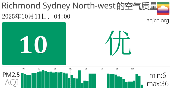 Richmond Sydney North-west的空气污染指数是优 - 2025年10月11日, 04:00Richmond Sydney North-west的空气污染指数是优