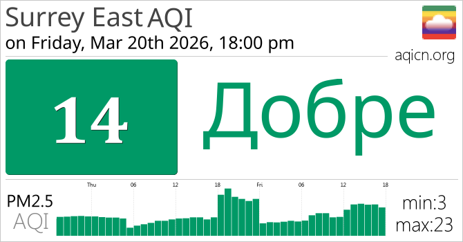 Якість повітря в місті Surrey East, British Columbia становить Добре