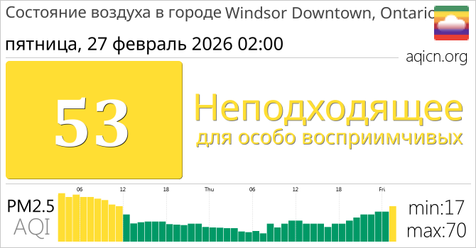 Качество воздуха в Windsor Downtown, Ontario, Канада является Неподходящее для особо восприимчивых