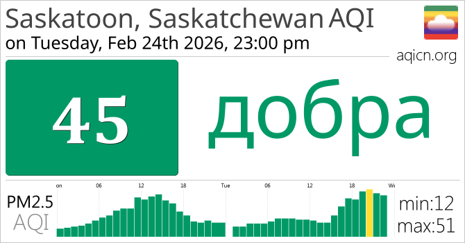 Якасць паветра ў Saskatoon, Saskatchewan, Canada складае добра