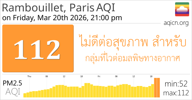 คุณภาพอากาศของ Rambouillet, Paris, France อยู่ที่ ไม่ดีต่อสุขภาพ สำหรับ กลุ่มที่ไวต่อมลพิษทางอากาศ หรือกลุ่มที่แพ้อากาศง่าย