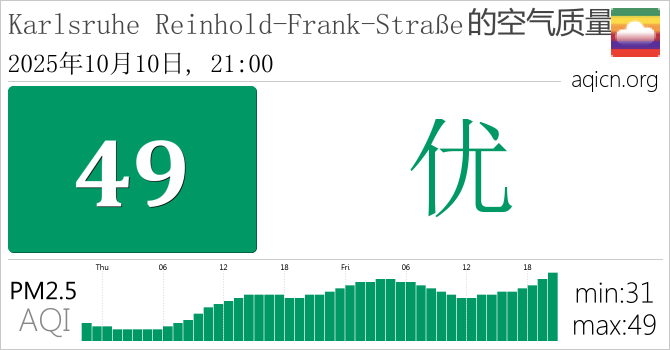 Karlsruhe Reinhold-Frank-Straße, 德国的空气污染指数是优 - 2025年10月10日, 21:00Karlsruhe Reinhold-Frank-Straße, 德国的空气污染指数是优