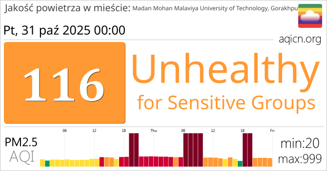 Jakość powietrza w mieście Madan Mohan Malaviya University of Technology, Gorakhpur, Indie jest Unhealthy for Sensitive Groups