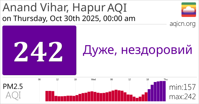 Якість повітря в місті Anand Vihar, Hapur, India становить Дуже, нездоровий