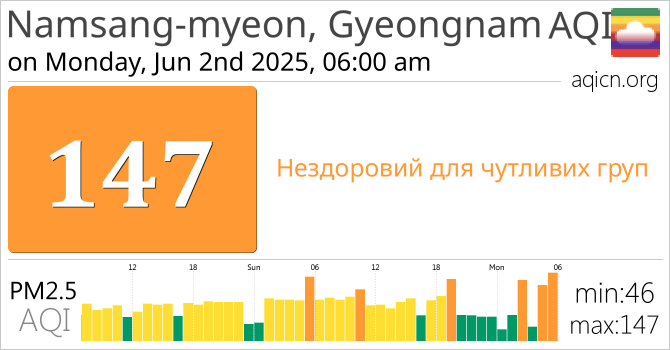 Якість повітря в місті Namsang-myeon, Gyeongnam, South Korea становить Нездоровий для чутливих груп