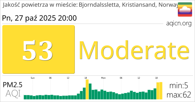 Jakość powietrza w mieście Bjorndalssletta, Kristiansand, Norway, Norwegia jest Moderate