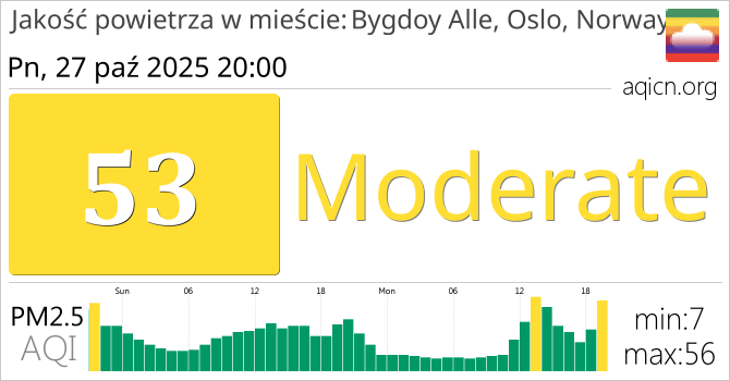 Jakość powietrza w mieście Bygdoy Alle, Oslo, Norway, Norwegia jest Moderate
