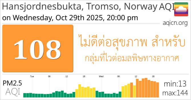 คุณภาพอากาศของ Hansjordnesbukta, Tromso, Norway, Norway อยู่ที่ ไม่ดีต่อสุขภาพ สำหรับ กลุ่มที่ไวต่อมลพิษทางอากาศ หรือกลุ่มที่แพ้อากาศง่าย