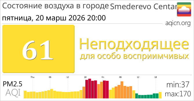 Качество воздуха в Smederevo Centar, Сербия является Неподходящее для особо восприимчивых