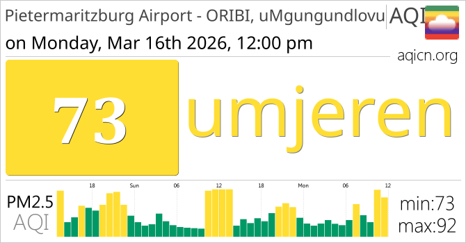 Kvaliteta zraka u gradu Pietermaritzburg Airport - ORIBI, uMgungundlovu, South Africa je umjeren