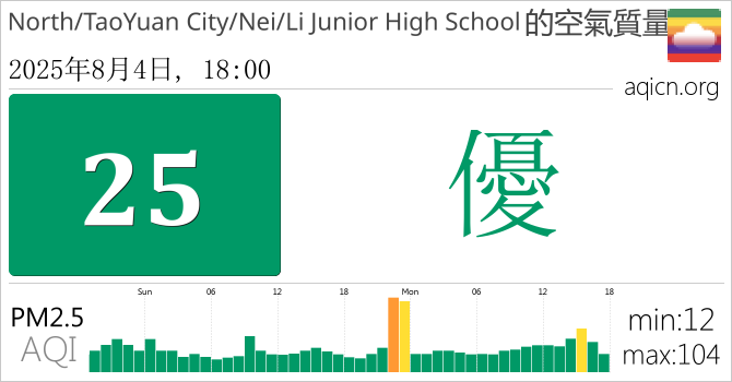 台灣North/TaoYuan City/Nei/Li Junior High School的空氣污染指數是優