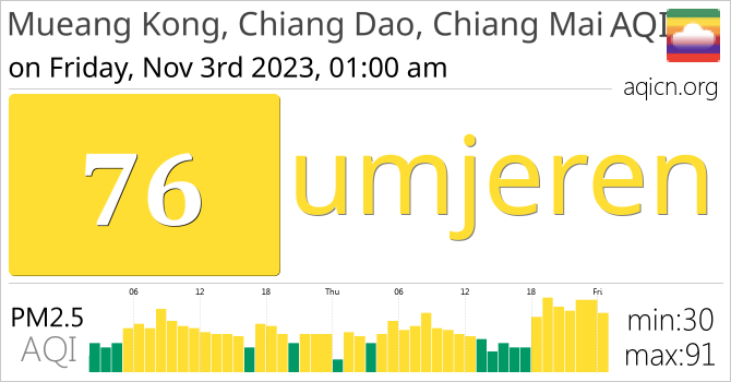 Kvaliteta zraka u gradu Mueang Kong, Chiang Dao, Chiang Mai, Thailand je umjeren