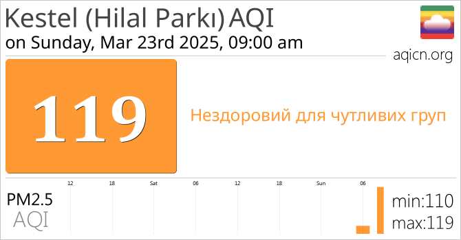 Якість повітря в місті Kestel (Hilal Parkı), Turkey становить Нездоровий для чутливих груп