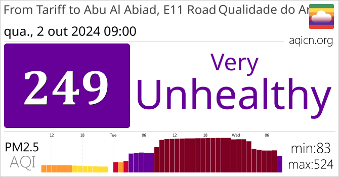 A qualidade do ar em From Tariff to Abu Al Abiad, E11 Road, Emirados Árabes Unidos é Very Unhealthy